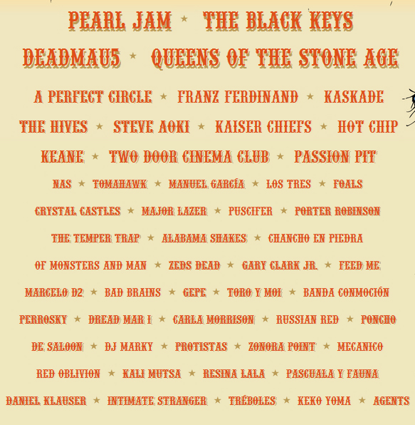 Eis que line-up surgida na semana passada era verdadeira. O Lollapalooza Chile finalmente revelou suas atrações (imagem), o festival terá Pearl Jam, the Black Keys, QOTSA e Deadmau5 como headliners. Destacamos outras bandas interessantes na programação: Franz Ferdinand, Hot Chip, Passion Pit, Foals, Crystal Castles, Major Lazer e Alabama Shakes.